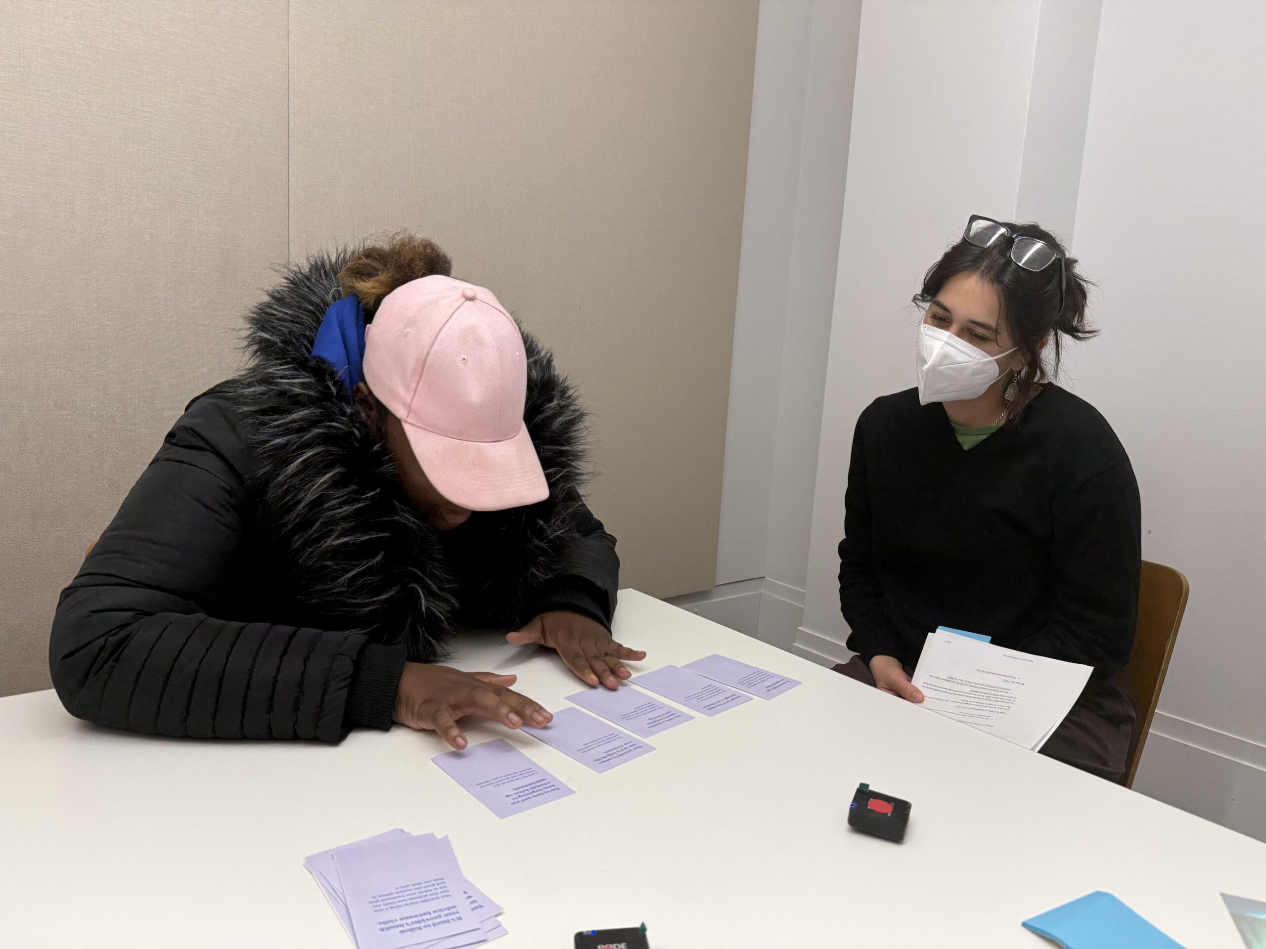 A PPL researcher conducts an interview with a participant using design stimuli.