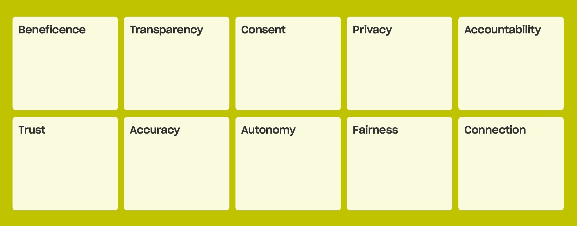 Notably, nine of the ten principles reflect areas of convergence in the ethical AI frameworks with the exception of Connection. The relationship between patients and their providers emerged as one of the most important themes in our research, yet it falls outside the scope of most ethical frameworks. This finding underscores why patient voices are essential: not just to define how principles apply in practice, but to identify which principles matter in the first place.